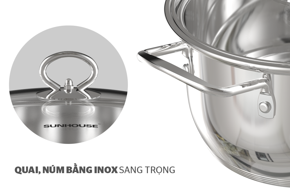 Nồi SUNHOUSE có quai và núm được làm bằng inox dạng đũa, vừa đảm bảo tính thẩm mỹ mà vừa có khả năng chống bỏng tốt. Bên cạnh đó, quai, núm inox giúp người dùng dễ dàng cầm nắm, di chuyển trong quá trình nấu nướng.