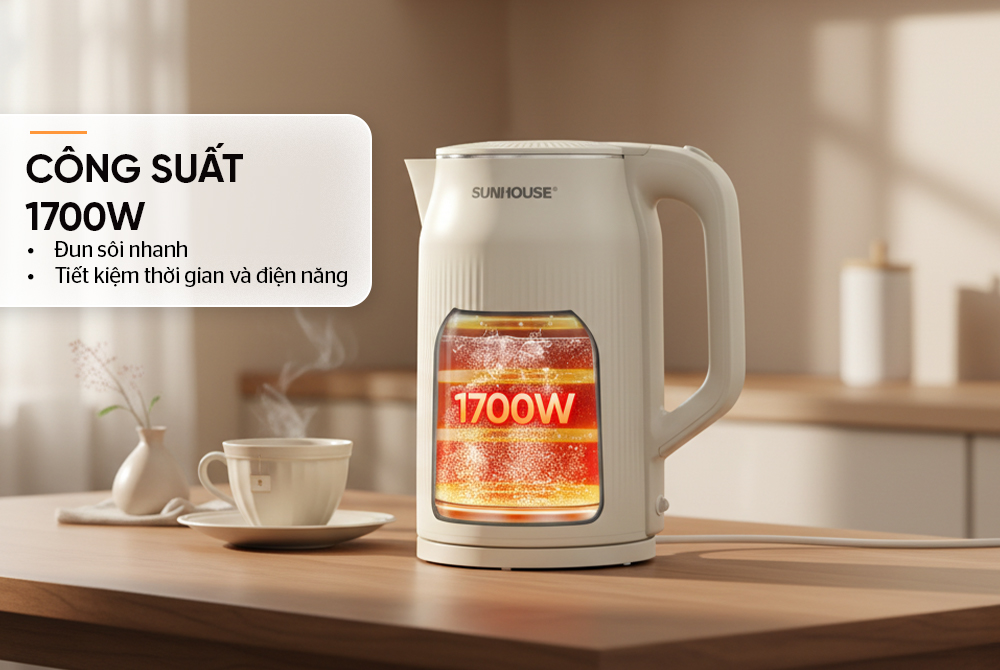 Với công suất 1700W, Ấm siêu tốc inox 2 lớp 3L Sunhouse SHD1365 giúp nước đạt điểm sôi chỉ trong vài phút, tiết kiệm tối đa thời gian và điện năng.
