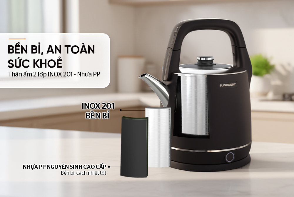 • Thân ấm 2 lớp INOX - Nhựa PP cách nhiệt, an toàn sức khỏe