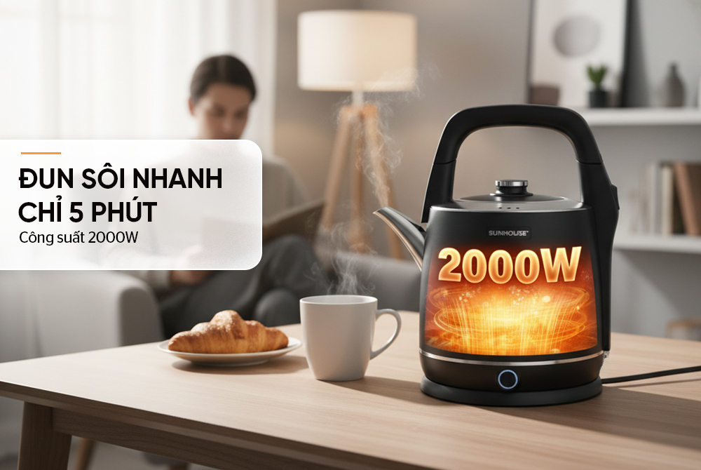 • Công suất lớn 2000W, đun sôi nhanh chóng chỉ 5 phút