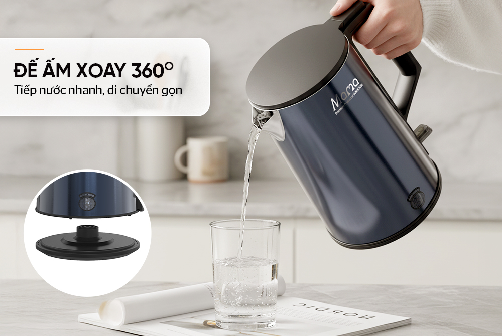 Đế tiếp điện tách rời thân ấm, giúp việc đổ và rót nước dễ dàng, linh hoạt. Ấm có thể xoay 360°, đặt lên hay nhấc ra khỏi đế ở bất cứ góc nào mà không cần căn chỉnh.