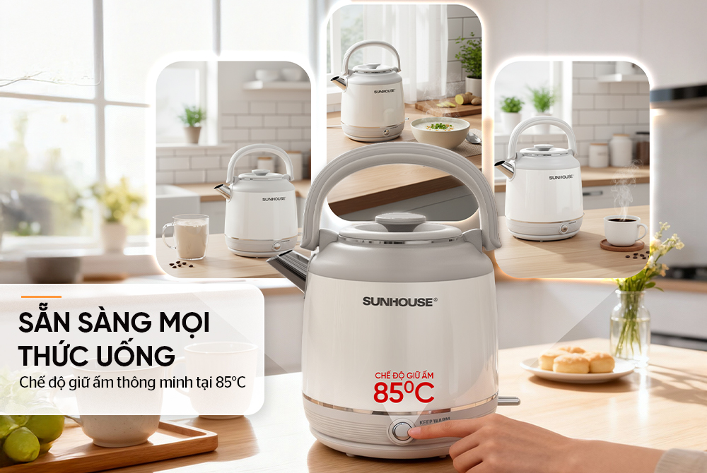 Ấm siêu tốc Inox giữ nhiệt 2.5L Sunhouse SHD1392 tích hợp chế độ giữ ấm thông minh lên tới 85°C, giúp nước nóng luôn sẵn sàng cho mọi thức uống mà không cần đun lại nhiều lần. Tính năng này mang đến sự tiện nghi rõ rệt, đặc biệt phù hợp cho những gia đình thường xuyên pha trà, cà phê hay sữa, đồng thời góp phần tiết kiệm điện năng và nâng cao trải nghiệm sử dụng.