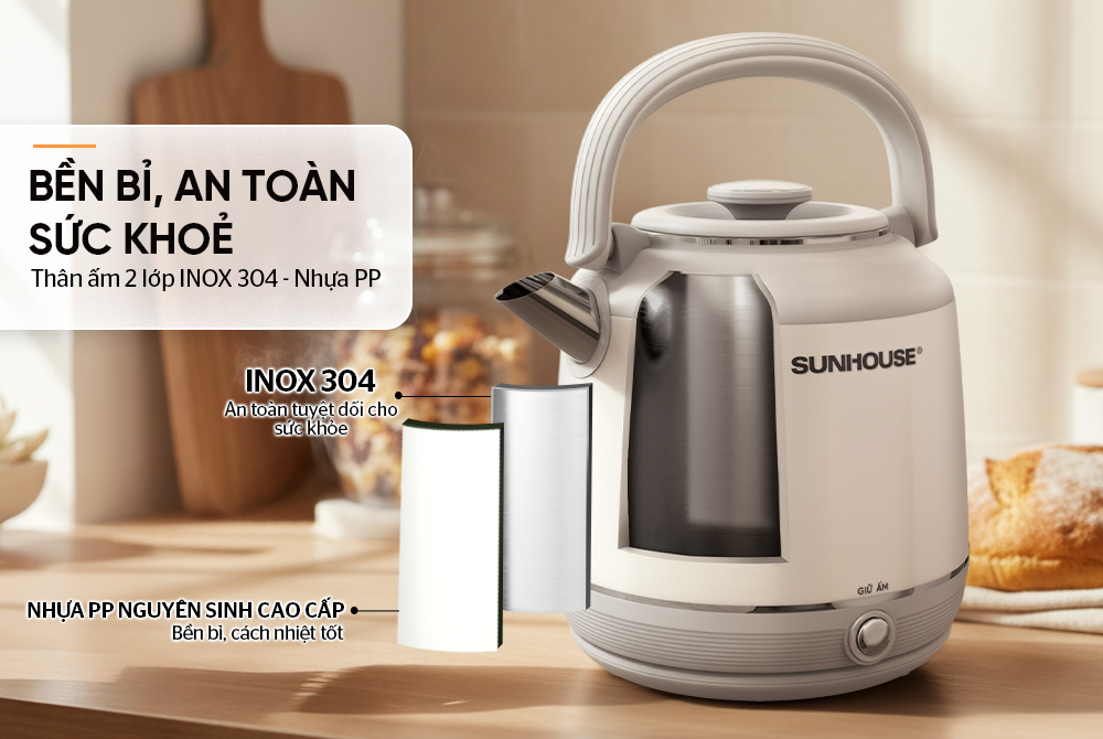 Ấm siêu tốc Inox giữ nhiệt 2.5L Sunhouse SHD1392 có thiết kế thân ấm 2 lớp gồm Inox 304 bên trong và nhựa PP cao cấp bên ngoài, giúp giữ nhiệt tốt, cách nhiệt an toàn, đồng thời tăng độ bền khi sử dụng lâu dài. Inox 304 được chứng nhận an toàn thực phẩm, không gỉ sét, không thôi nhiễm chất độc hại, đảm bảo nguồn nước luôn tinh khiết và tốt cho sức khỏe người dùng.