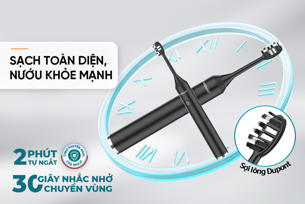 Bàn chải có tính năng tự ngắt sau 2 phút – đúng chuẩn thời gian chải răng mà nha sĩ khuyến nghị cho một lần vệ sinh. Ngoài ra, sản phẩm còn nhắc chuyển vùng mỗi 30 giây, giúp người dùng làm sạch đều 4 khu vực trong khoang miệng thay vì tập trung một chỗ.