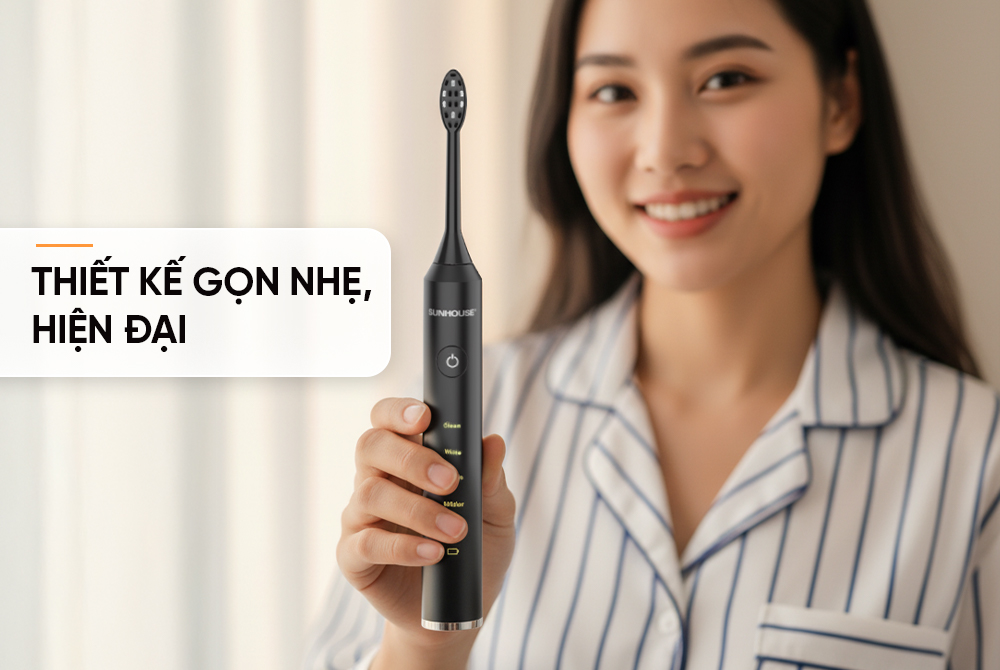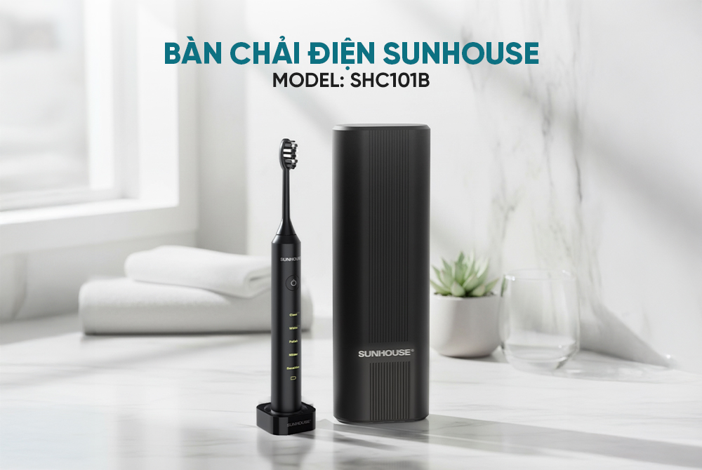 Bàn chải điện Sunhouse SHC100B là giải pháp chăm sóc răng miệng toàn diện, tích hợp 5 chế độ thông minh phù hợp từng nhu cầu: làm sạch – làm trắng – đánh bóng – nhẹ nhàng – nhạy cảm. Công nghệ sóng âm mạnh mẽ 40.000 nhịp/phút kết hợp đầu lông Dupont cao cấp giúp làm sạch sâu nhưng vẫn êm ái cho nướu. Thời gian sử dụng lên đến 90 ngày chỉ với một lần sạc cùng thiết kế sang – gọn – bền bỉ khiến sản phẩm trở thành lựa chọn tối ưu cho gia đình hiện đại.