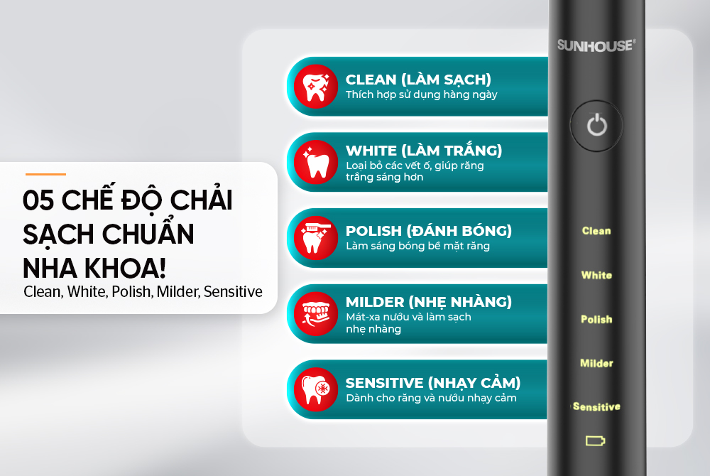 Bàn chải điện Sunhouse SHC100B được trang bị 5 chế độ chuyên sâu giúp đáp ứng mọi nhu cầu: làm sạch hằng ngày, làm trắng, đánh bóng, chải nhẹ nhàng và cho răng nhạy cảm. Mỗi chế độ được thiết lập mức rung riêng giúp tăng hiệu quả làm sạch nhưng vẫn đảm bảo sự êm ái cho răng – nướu.