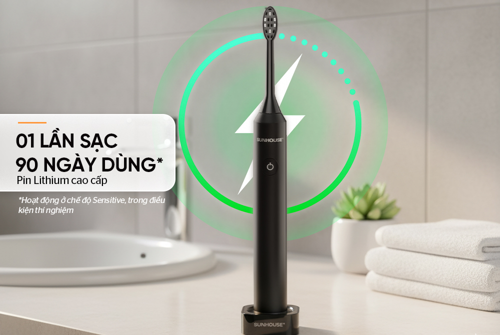 Bàn chải điện Sunhouse SHC100B sử dụng pin Lithium cao cấp, cho thời lượng dùng dài phù hợp người bận rộn hoặc hay di chuyển. Một lần sạc đầy cho thời gian sử dụng khoảng 90 ngày (ở chế độ Sensitive), hạn chế tối đa tình trạng gián đoạn khi đang dùng.