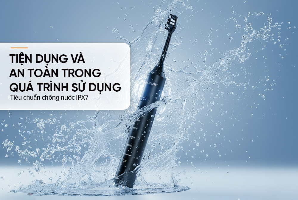 Bàn chải điện Sunhouse SHC100B đạt chuẩn chống nước IPX7, cho phép rửa trực tiếp dưới vòi nước hoặc sử dụng trong phòng tắm mà không lo hư hỏng. Đây là lựa chọn phù hợp cho gia đình có trẻ nhỏ hoặc người thích vừa tắm vừa đánh răng, vẫn an toàn và bền bỉ theo thời gian.\