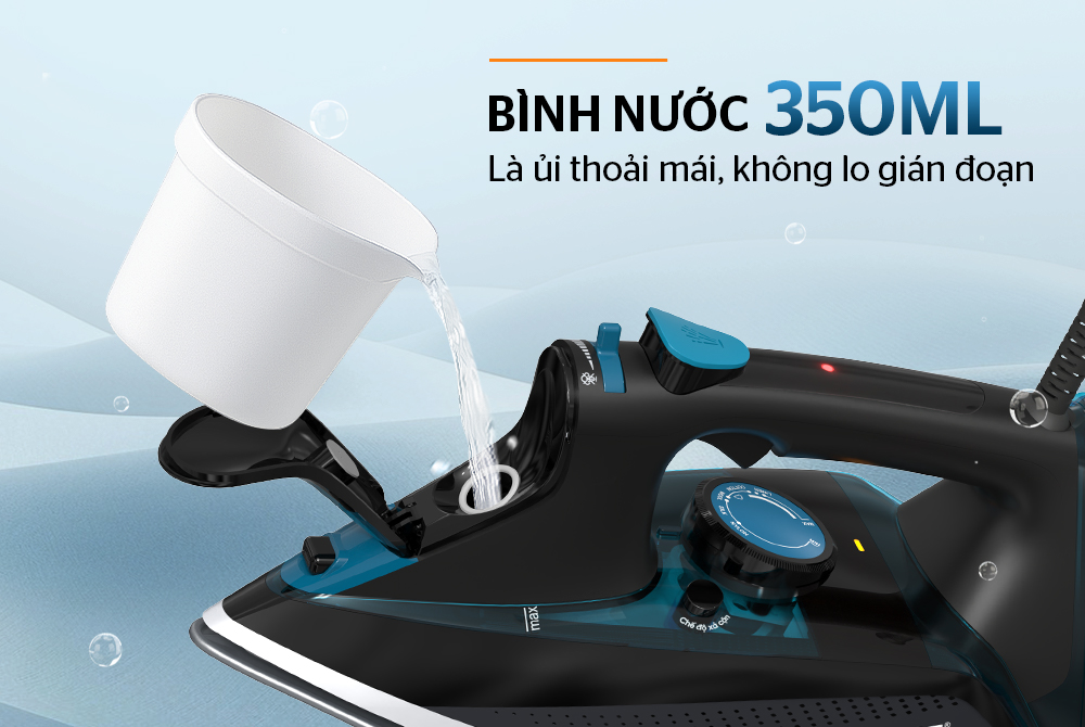 Bàn là hơi Sunhouse Mama SHD2071 sở hữu bình nước dung tích 350ml, cho phép tạo hơi nước liên tục mà không cần châm nước nhiều lần. Điều này giúp quá trình ủi đồ liền mạch và thuận tiện hơn. Dung tích lớn hỗ trợ Bàn là hơi Sunhouse Mama SHD2071 đáp ứng tốt nhu cầu ủi nhiều quần áo trong một lần, phù hợp cho gia đình đông người.