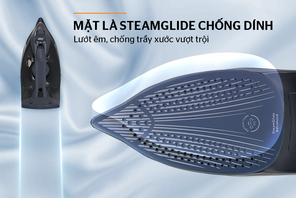 Mặt đế SteamGlide có độ hoàn thiện cao, tạo ra bề mặt siêu trơn và chống dính vượt trội. So với mặt đế thông thường, SteamGlide giúp bàn là trượt nhẹ, hạn chế tối đa ma sát và không làm xước bề mặt vải, đặc biệt là chất liệu mỏng hoặc dễ hư như lụa, voan.