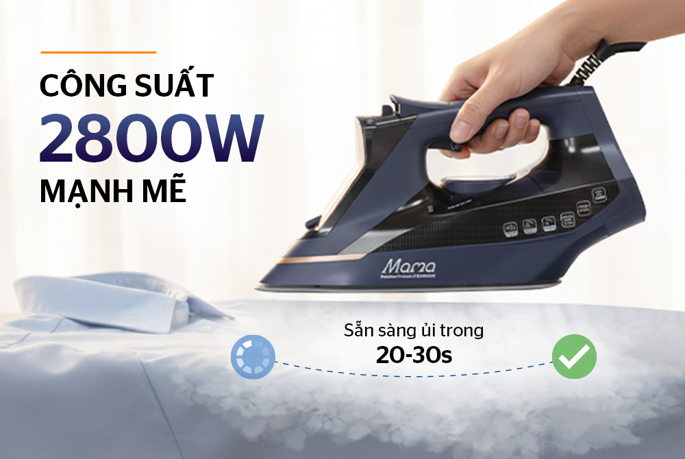 Công suất 2800W mạnh mẽ – Sẵn sàng ủi chỉ sau 20–30 giây
