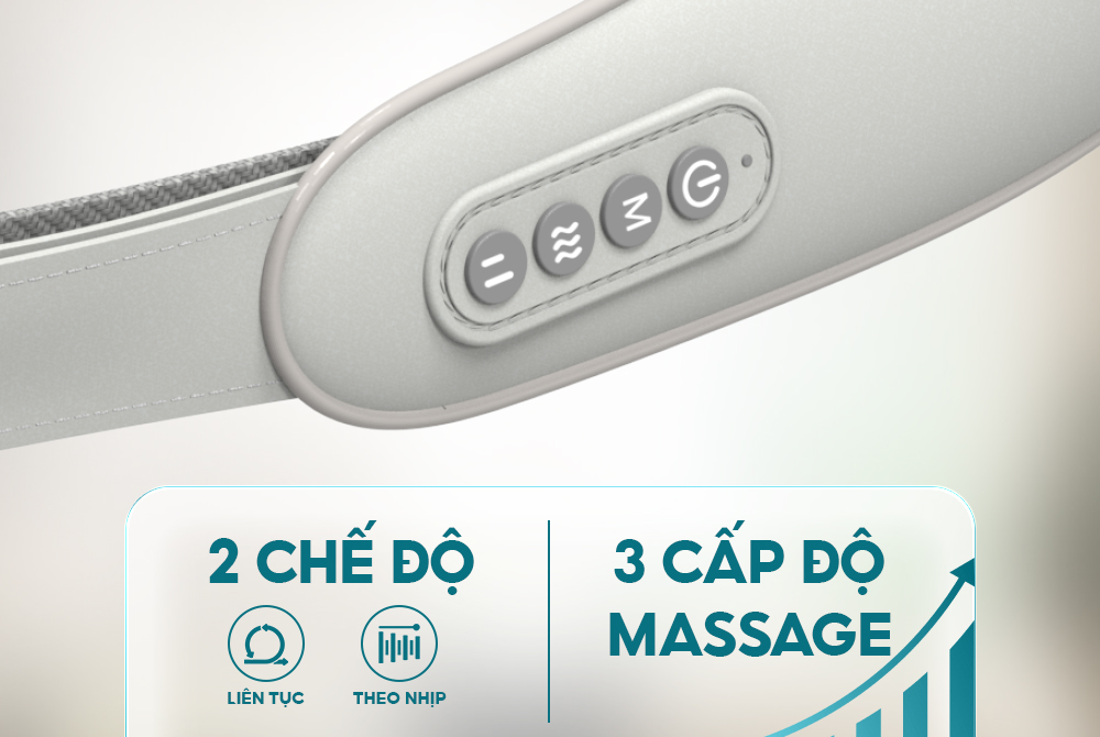 Bên cạnh đó, sản phẩm cho phép tùy chỉnh 3 cường độ massage: nhẹ, vừa, mạnh, giúp người dùng dễ dàng chọn lực tác động phù hợp với thể trạng và sở thích cá nhân. Cấp độ nhẹ phù hợp khi cần thư giãn dịu êm, cấp độ mạnh mang đến lực day ấn sâu giúp giãn cơ nhanh, giảm đau nhức vùng cổ vai gáy.