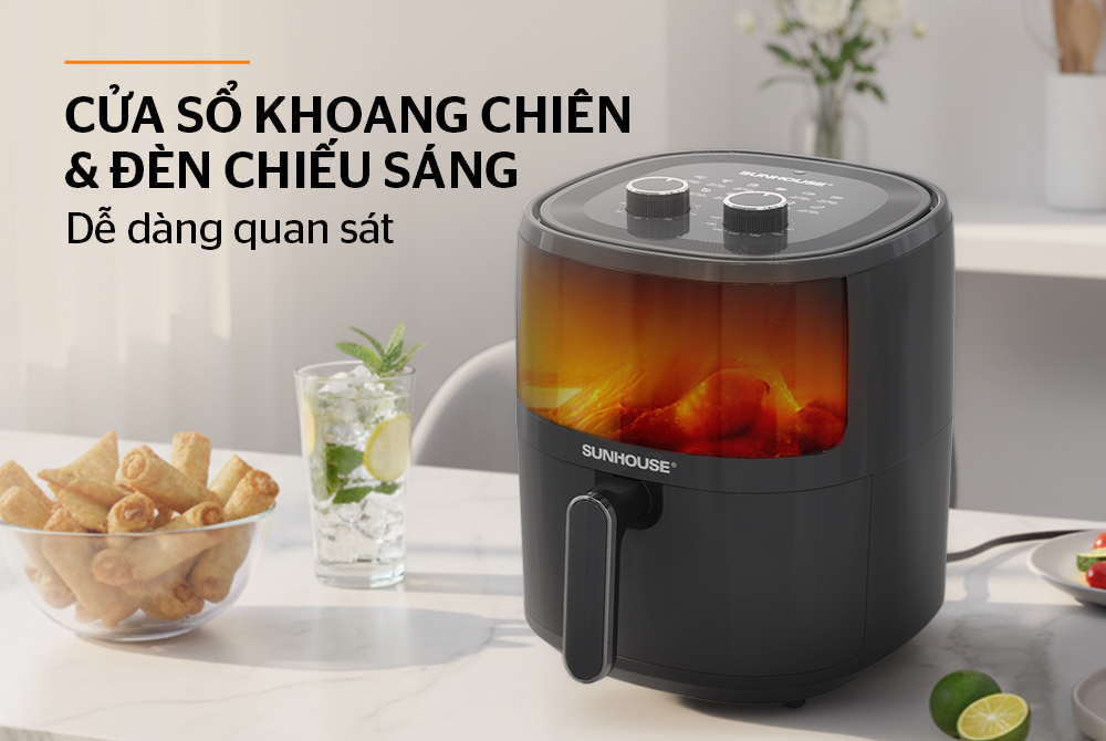 Nồi chiên không dầu 5L Sunhouse SHD4021 được trang bị cửa sổ kính kết hợp đèn chiếu sáng bên trong, cho phép quan sát toàn bộ quá trình nấu mà không cần mở nắp. Điều này giúp giữ nhiệt ổn định, món ăn chín đều và hạn chế thất thoát hơi nóng.