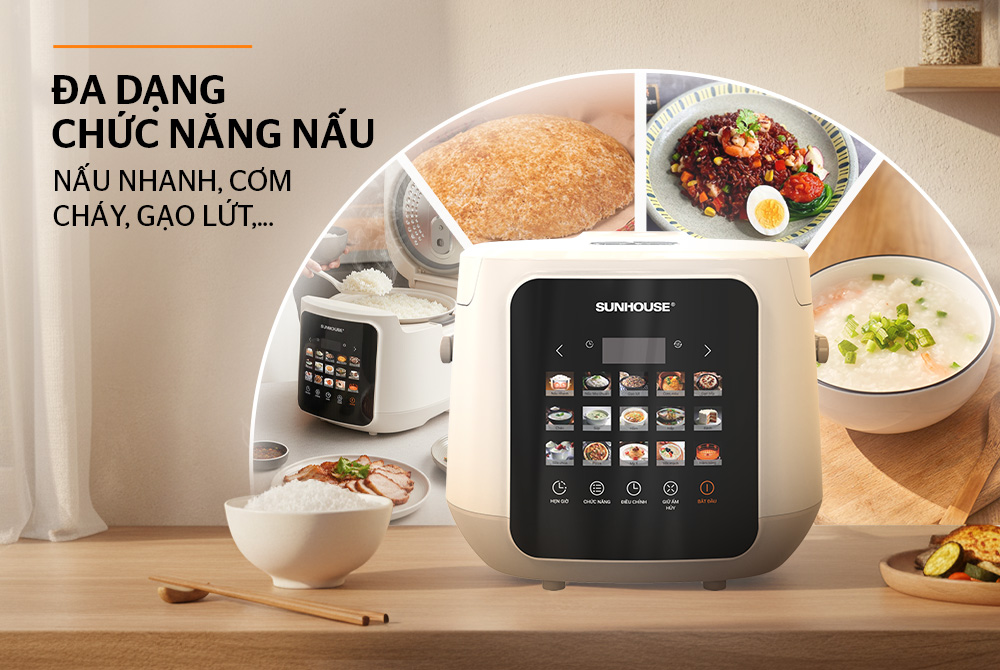 Nồi cơm điện tử 1.8L Sunhouse SHD8925 được trang bị 15 chế độ nấu tự động, đáp ứng trọn vẹn mọi nhu cầu nấu nướng của gia đình hiện đại. Trong đó, đặc biệt phải kể đến chức năng Nấu nhanh giúp rút ngắn thời gian chế biến mà vẫn đảm bảo cơm chín đều, dẻo thơm – lý tưởng cho những ngày bận rộn.