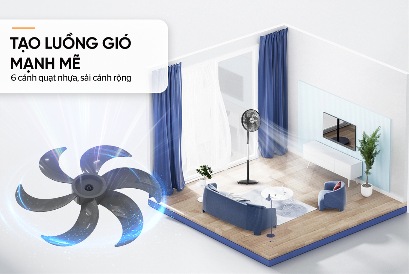 • 6 cánh quạt nhựa sải cánh rộng, tạo luồng gió mạnh mẽ