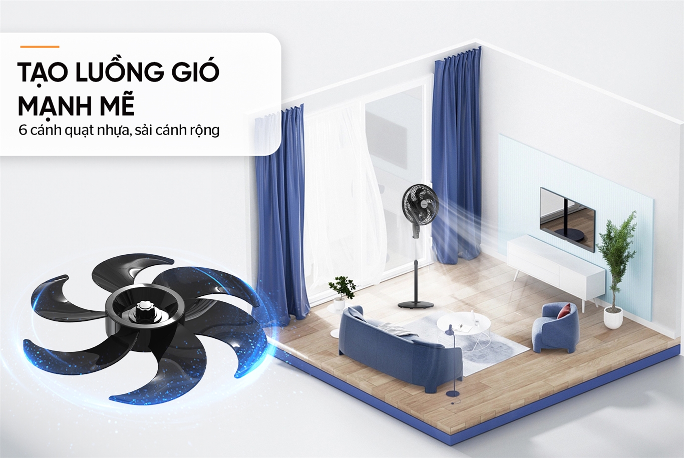 • 6 cánh quạt nhựa sải cánh rộng, tạo luồng gió mạnh mẽ