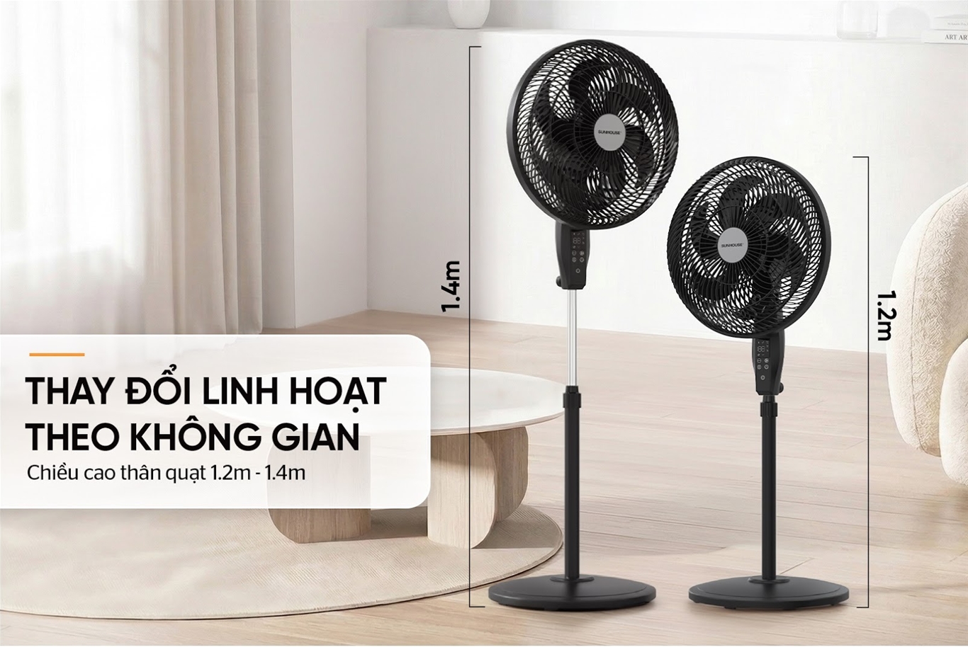 • Chiều cao thân quạt linh hoạt 1.2m - 1.4m