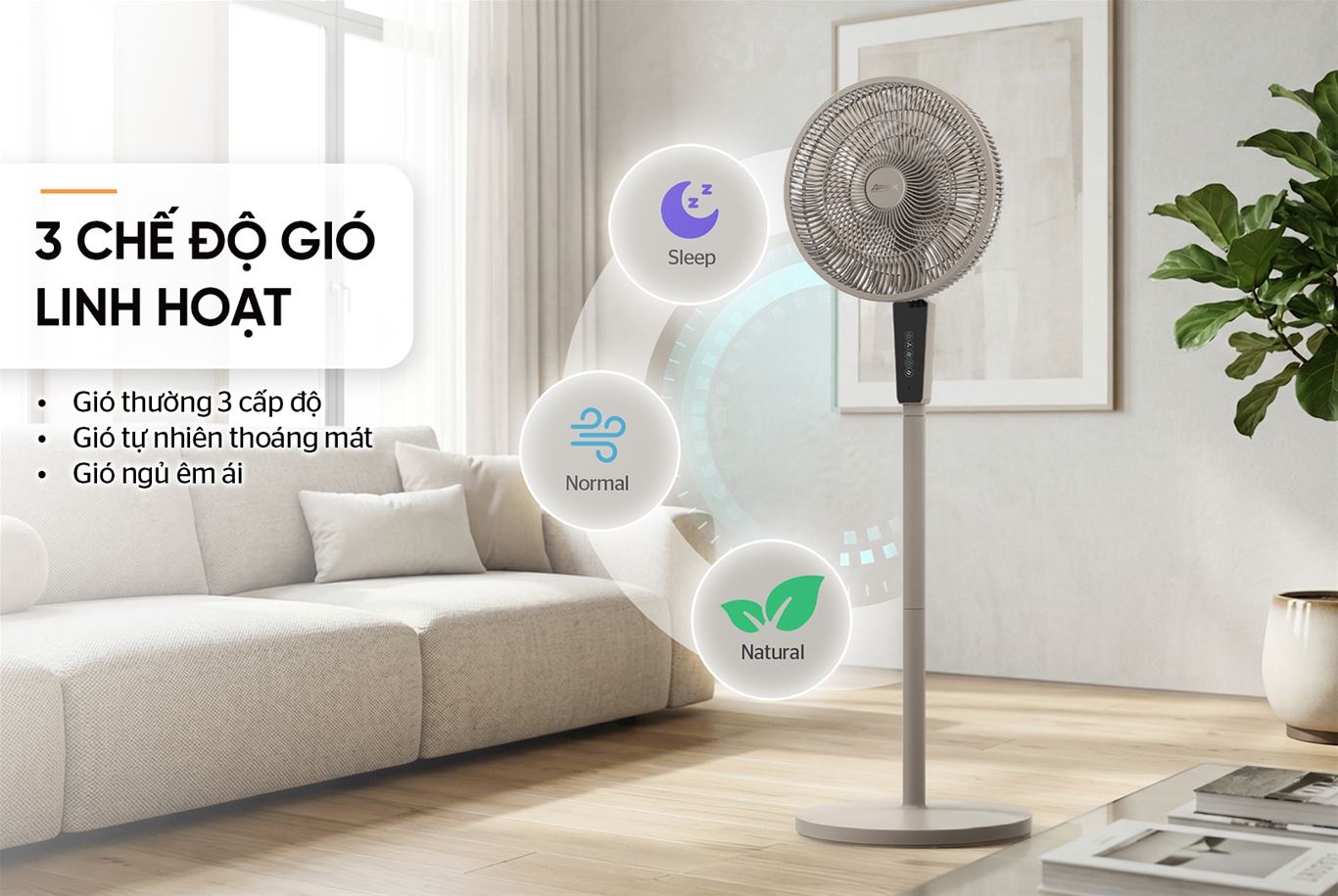 Chế độ gió ngủ tạo làn gió dịu êm và tự động giảm dần theo nhịp sinh học khi cơ thể bước vào trạng thái ngủ sâu. Khi thân nhiệt giảm về đêm, quạt sẽ điều chỉnh tốc độ phù hợp, giúp hạn chế cảm giác lạnh buốt hoặc khô họng do gió thổi mạnh liên tục, từ đó bảo vệ sức khỏe và mang lại giấc ngủ trọn vẹn hơn.