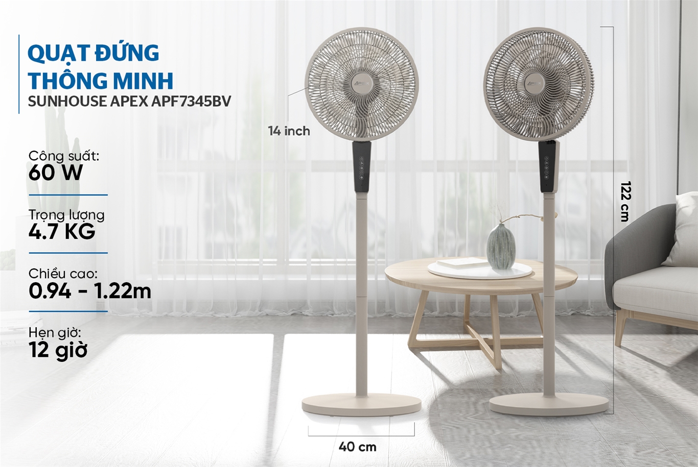 Quạt đứng thông minh SUNHOUSE APEX APF7345BV mang đến trải nghiệm làm mát hiện đại với khả năng điều khiển bằng giọng nói tiện lợi, giúp người dùng thao tác nhanh chóng mà không cần lại gần thiết bị. Bên cạnh đó, sản phẩm còn được trang bị 3 chế độ gió đa dạng, kết hợp động cơ đồng và trục quay ổ bi giúp quạt vận hành êm ái, bền bỉ, mang lại không gian mát mẻ và dễ chịu cho cả gia đình.