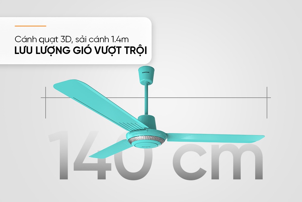 Quạt trần 3 cánh SUNHOUSE SHD7659GR với đường kính sải cánh 140cm và lưu lượng gió 230 m³/phút, mang đến luồng gió mạnh mẽ và lan tỏa rộng khắp không gian. Nhờ khả năng làm mát nhanh chóng, quạt giúp không khí luôn thông thoáng và thoải mái, lý tưởng cho những ngày hè oi bức.