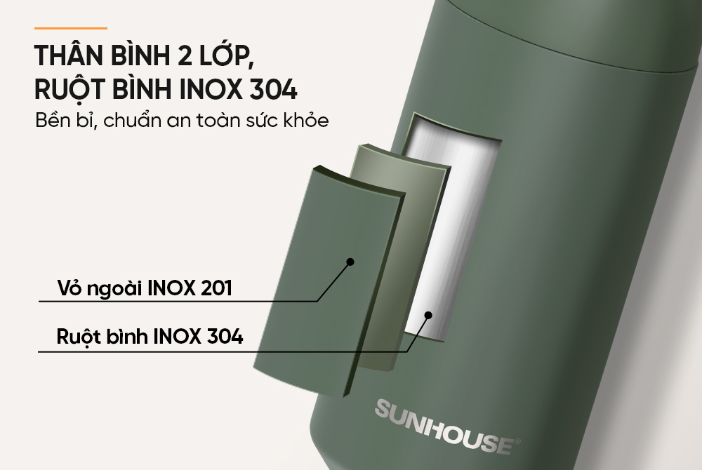 Thân bình 2 lớp - Ruột INOX 304 cao cấp Bình giữ nhiệt Easy Go 350ml SUNHOUSE KS-TU350EG được cấu tạo thân 2 lớp cách nhiệt hiệu quả, giữ nhiệt độ ổn định suốt nhiều giờ. Ruột bình làm từ INOX 304 an toàn, không gỉ, không thôi nhiễm chất độc hại, đảm bảo an toàn cho sức khỏe người dùng.