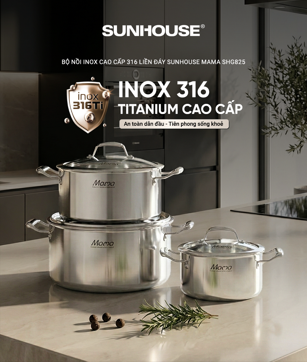 BỘ NỒI INOX CAO CẤP 316 LIỀN ĐÁY SUNHOUSE MAMA SHG825