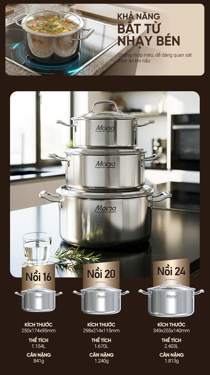 • Hiệu suất bắt từ vượt trội nhờ lớp ngoài inox 430, tương thích với mọi loại bếp