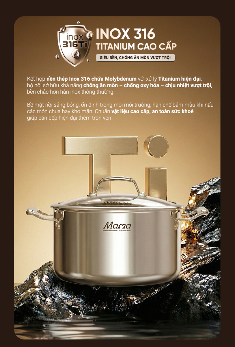 • Lòng nồi chất liệu Inox 316 Titanium cao cấp chuẩn y tế, chống ăn mòn mạnh mẽ, chịu muối – axit – hóa chất tẩy rửa, bền vượt trội