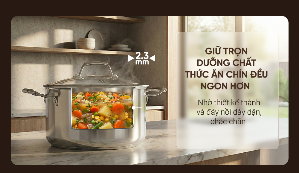 • Cấu tạo 5 lớp vật liệu (Inox 316Ti/3 lớp nhôm/Inox 430) giúp truyền nhiệt nhanh, tỏa nhiệt đều, thực phẩm chín chuẩn, giữ trọn dinh dưỡng và tiết kiệm năng lượng