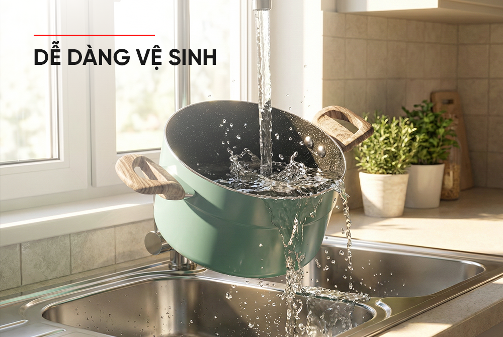 Nhờ lớp sơn ngoài chịu nhiệt và chống bám bẩn, bộ nồi luôn giữ được vẻ ngoài sáng bóng. Chỉ với vài thao tác lau rửa đơn giản, bạn đã có ngay chiếc nồi sạch sẽ, tiết kiệm thời gian và công sức.
