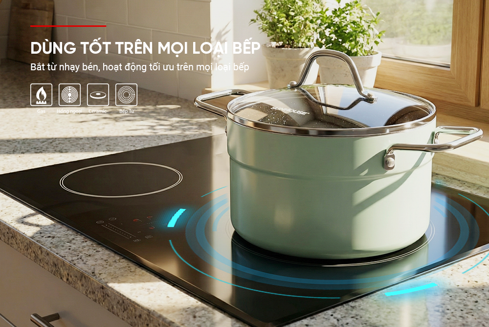 • Dùng trên mọi loại bếp: Bếp từ, bếp gas, bếp hồng ngoại, bếp điện