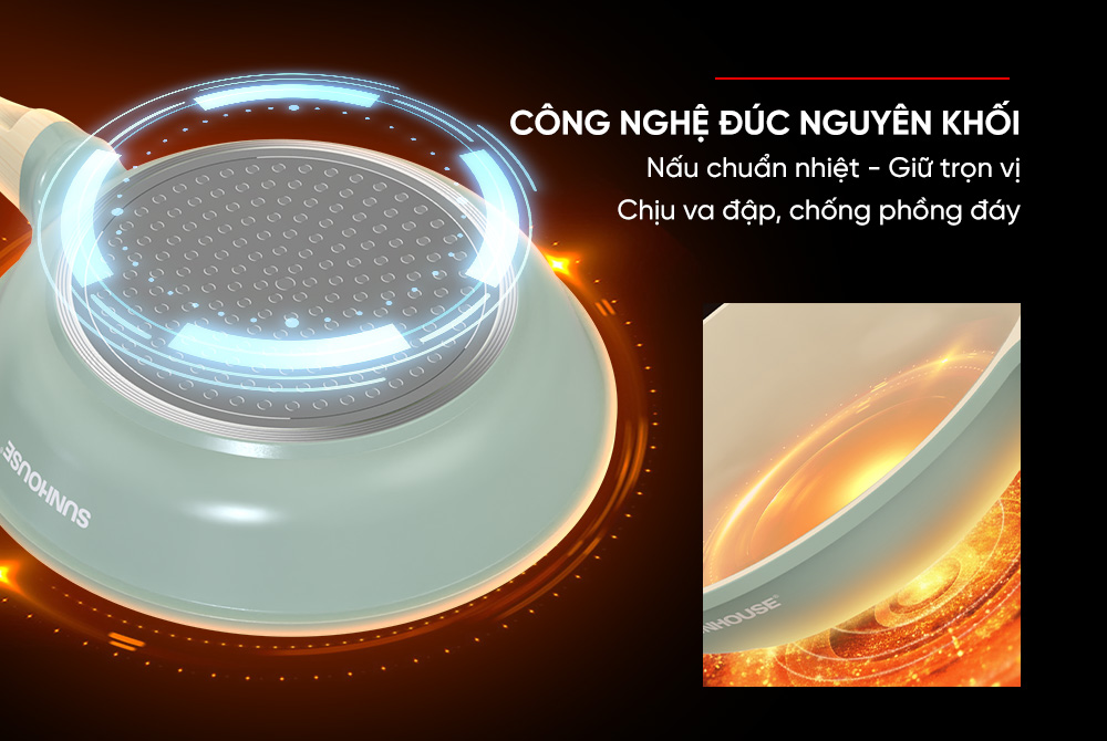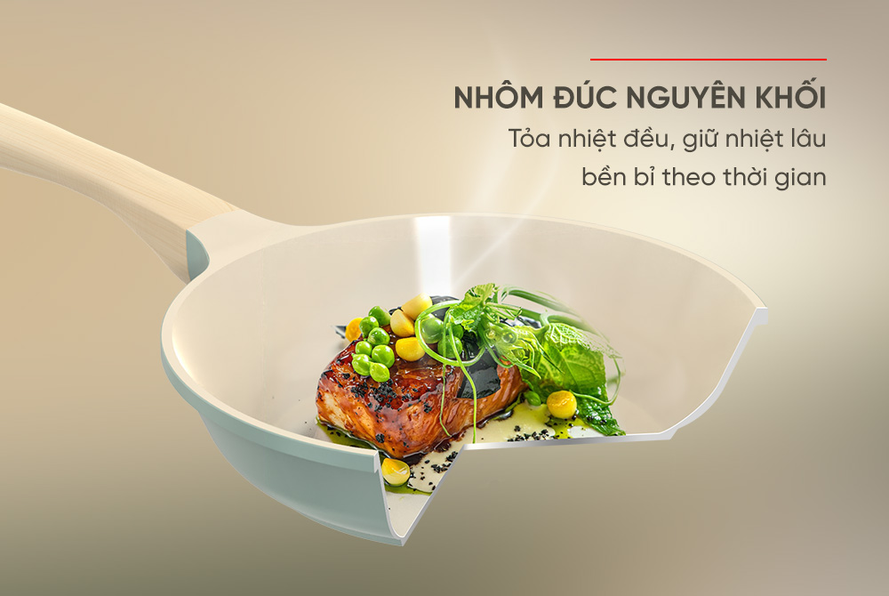Chảo được chế tác từ nhôm đúc nguyên khối, không ghép nối, mang lại độ cứng chắc tuyệt đối, chịu lực va đập mạnh và hạn chế tối đa tình trạng biến dạng hay phồng đáy khi dùng ở nhiệt độ cao. Công nghệ đúc nguyên khối còn giúp truyền nhiệt chính xác, ổn định và duy trì độ bền vượt trội theo thời gian.