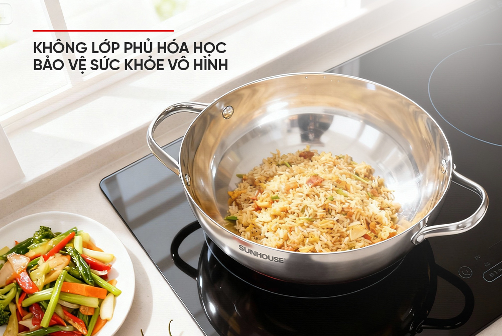 Đặc biệt, để tối ưu hiệu quả chống dính tự nhiên và giúp các món chiên xào ngon chuẩn vị, bạn có thể tham khảo cách “tôi chảo” đơn giản với Chảo xào inox liền khối SUNHOUSE Healthy. Thao tác đúng cách ngay từ lần sử dụng đầu tiên sẽ giúp hình thành lớp chống dính tự nhiên, hạn chế bám dính thực phẩm và nâng cao độ bền cho sản phẩm.
