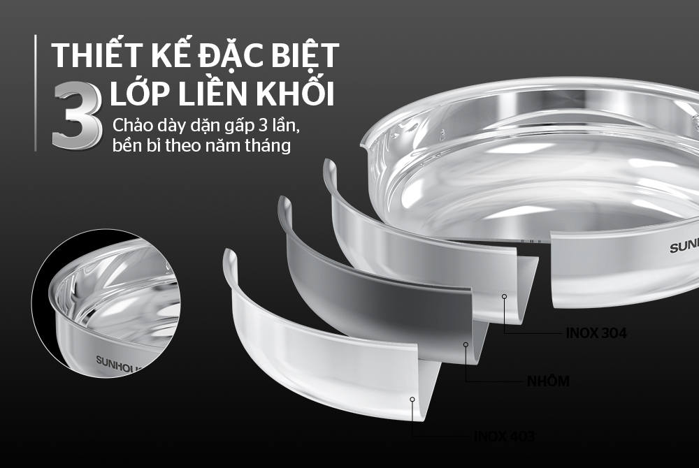 Chảo được chế tác với cấu trúc 3 lớp liền khối dày dặn gấp 3 lần, gồm Inox 304 - Nhôm - Inox 430 tối ưu cả độ bền và hiệu suất nấu nướng. Lớp inox 304 trong cùng an toàn khi tiếp xúc trực tiếp với thực phẩm; lớp nhôm ở giữa dẫn nhiệt nhanh, tỏa nhiệt đều khắp bề mặt chảo; trong khi lớp inox 430 ngoài cùng tăng độ cứng, chống cong vênh và tương thích với mọi loại bếp, đặc biệt là bếp từ. Nhờ cấu trúc này, chảo vừa bền bỉ, hạn chế móp méo, cong vênh, vừa cho trải nghiệm nấu đầm tay, ổn định, tiết kiệm thời gian và năng lượng.