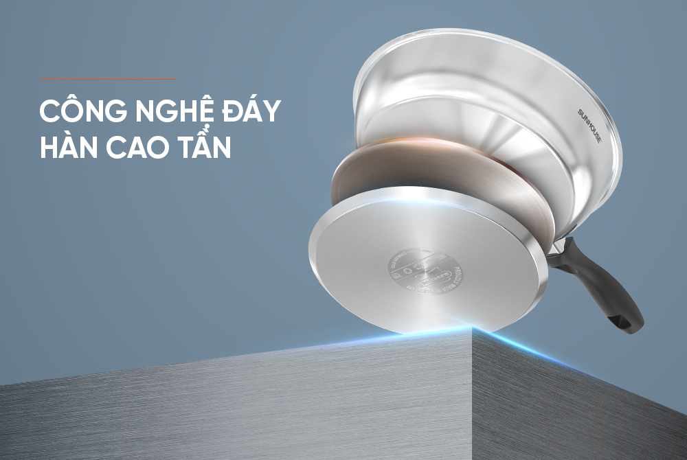 'Phiên bản nâng cấp của chảo IN16M4 được ứng dụng công nghệ đáy hàn cao tầng với lực dập lớn, giúp các lớp đáy liên kết chắc chắn và đạt độ phẳng cao. Công nghệ đem lại khả năng truyền nhiệt đều và nhanh hơn, giúp tiết kiệm thời gian nấu nướng mà thức ăn vẫn chín đều tuyệt hảo.