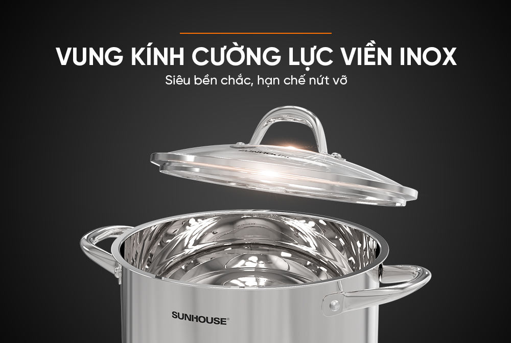 Vung nồi có thành phần là kính cường lực chắc chắn, giúp bạn quan sát thực phẩm trong nồi và hạn chế nứt vỡ. Viền inox sang trọng, bảo vệ vung nồi tránh vỡ khi va đạp, đảm bảo an toàn trong quá trình sử dụng.
