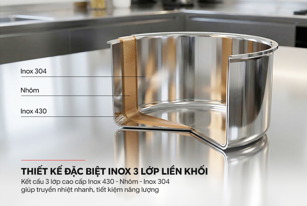 Cấu tạo inox 3 lớp liền khối bền chắc – Dẫn nhiệt nhanh, hạn chế phồng đáy