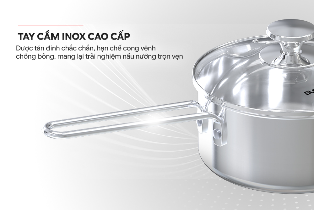Tay cầm và núm Inox đúc nguyên khối mang đến độ chắc chắn và bền bỉ vượt trội, hạn chế tối đa cong vênh hay lỏng lẻo trong quá trình sử dụng. Cấu trúc đúc đặc kết hợp tán đinh chắc chắn giúp cố định hoàn hảo, đảm bảo an toàn khi thao tác ở nhiệt độ cao. Khả năng chống bỏng hiệu quả cho phép người dùng cầm nắm thoải mái, mang lại trải nghiệm nấu nướng an tâm và thuận tiện hơn mỗi ngày.