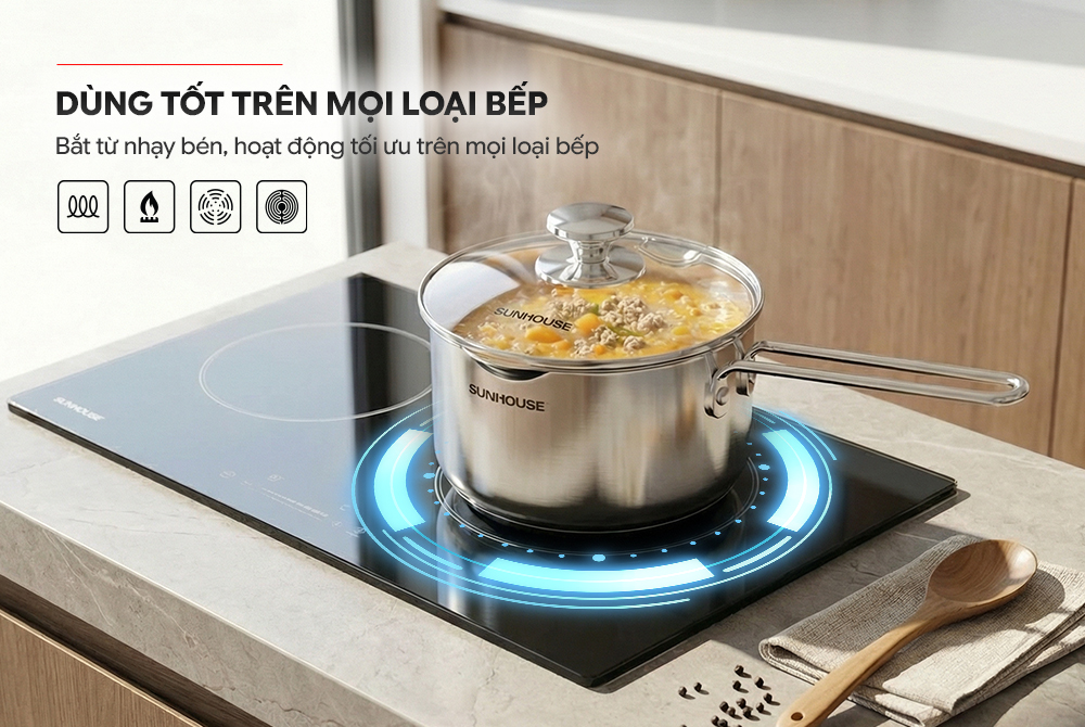 Quánh Inox 304 liền đáy Sunhouse Healthy SHG304-16 có khả năng bắt từ tốt, dùng dược trên mọi loại bếp như bếp từ, bếp gas, bếp hồng ngoại,...