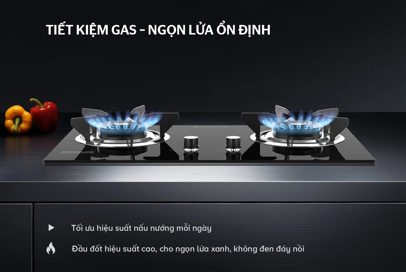 Bếp được trang bị đầu đốt hiệu suất cao, giúp ngọn lửa xanh lan tỏa đều và ổn định, tận dụng tối đa năng lượng gas, giảm thất thoát nhiệt. Nhờ đó, mỗi vùng nấu chỉ tiêu thụ khoảng 250g gas/giờ, tiết kiệm nhiên liệu đáng kể so với các dòng bếp thông thường mà vẫn đảm bảo món ăn chín nhanh, chín đều.