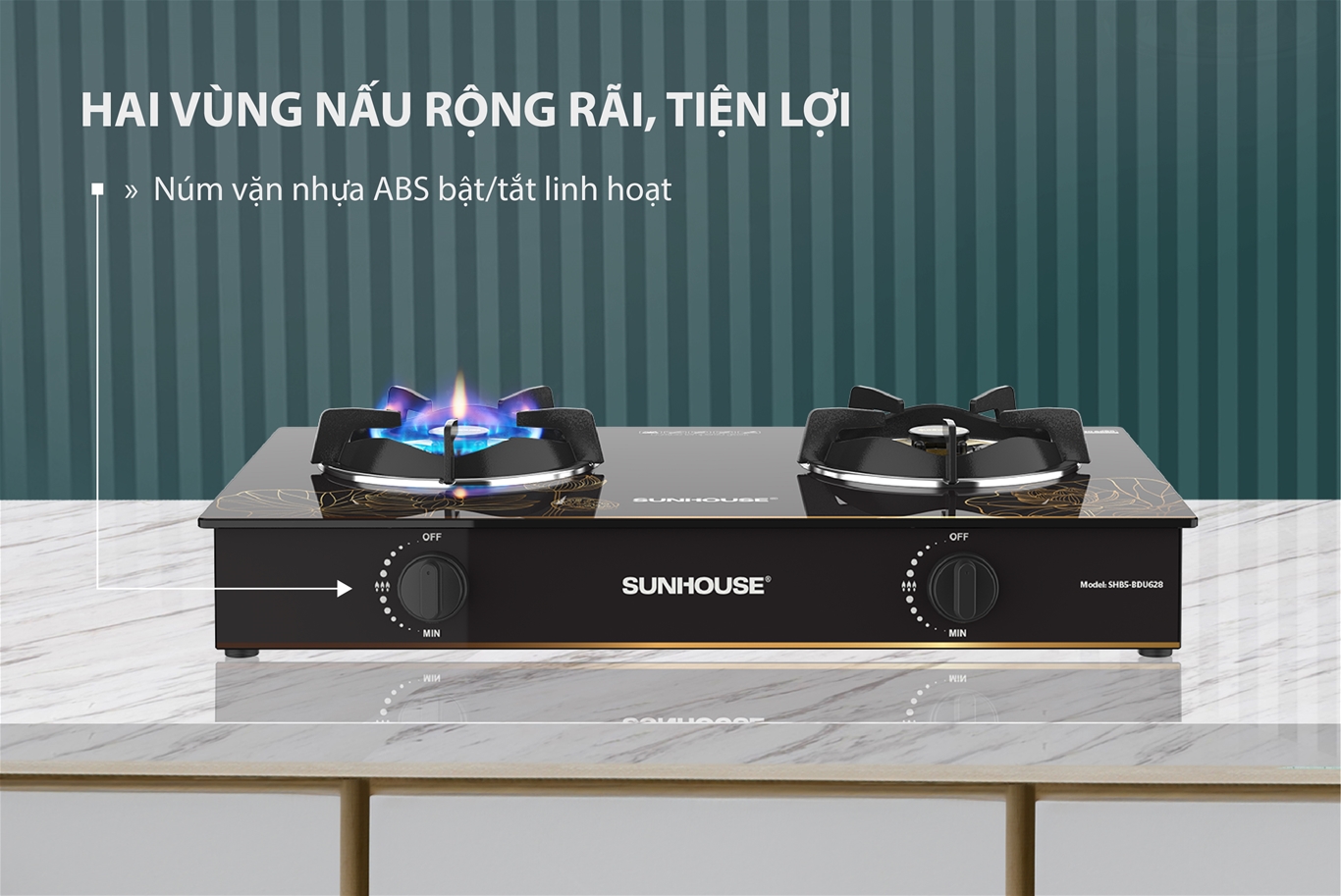 Bếp gas dương kính SUNHOUSE SHB5-BDU628 được trang bị 2 vùng nấu rộng rãi giúp người dùng chế biến được nhiều món ăn cùng lúc. Bạn có thể vừa nấu canh, vừa chiên xào thực phẩm một cách thật thoải mái kể cả với các loại nồi chảo lớn.