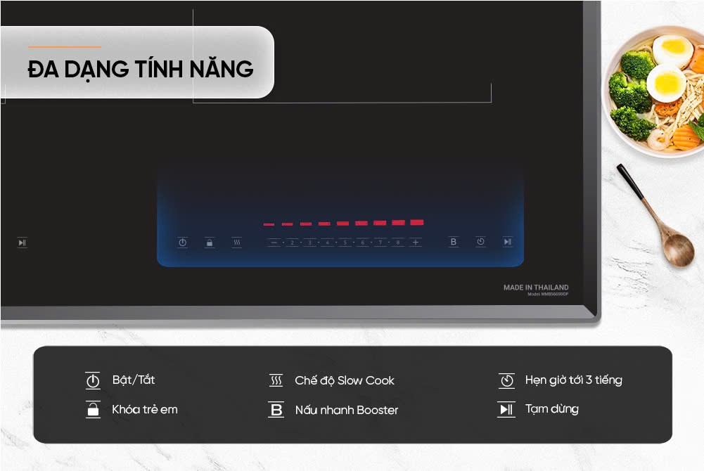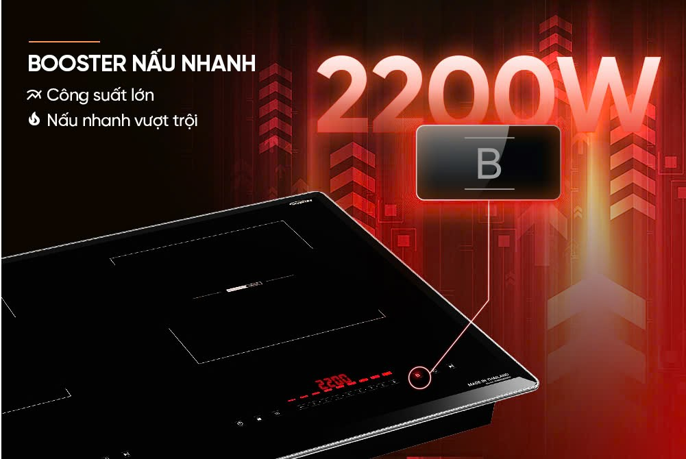 Chức năng Booster là tính năng đặc biệt cho những cá nhân, gia đình bận rộn nhưng vẫn muốn tận hưởng bữa ăn đầy đủ dinh dưỡng. Chỉ bằng một thao tác, bếp có thể gia tăng công suất lên tới 2200W, giúp rút ngắn thời gian nấu đến 50%. Món ăn được hoàn thiện nhanh chóng, mà không hề khô hay cháy, trái lại vẫn đậm đà, mọng nước.