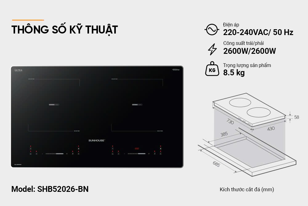 BẾP ĐÔI ĐIỆN TỪ SUNHOUSE SHB52026BN: NHIỆT ĐỀU CHUẨN VỊ, AN TÂM NẤU NƯỚNG