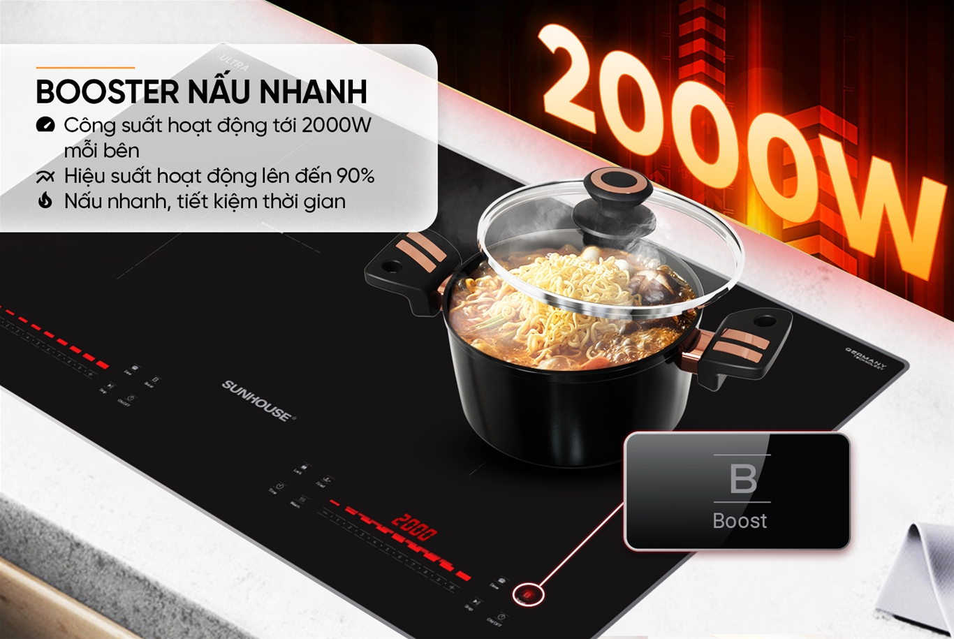 Chức năng nấu nhanh BOOSTER, giúp bếp đạt mức công suất tối đa chỉ trong thời gian ngắn. Nhờ đó, nhiệt lượng được truyền nhanh chóng, tăng hiệu suất nấu lên đến 90% so với bếp từ thông thường, giúp bạn nấu ăn nhanh hơn, tiết kiệm thời gian và năng lượng mà vẫn đảm bảo món ăn chín đều, ngon miệng.