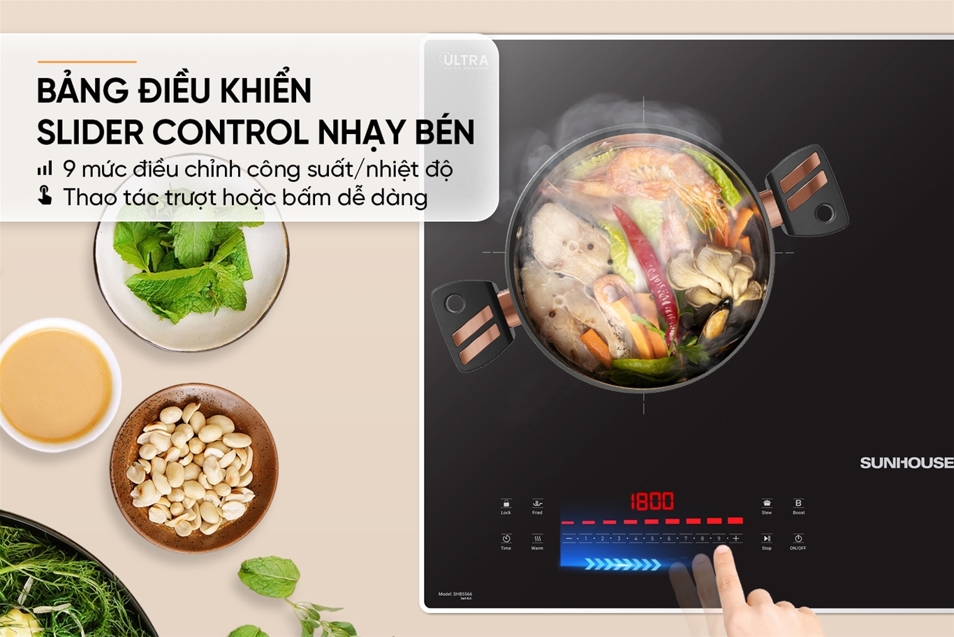 Bếp SUNHOUSE SHB5566 Seri 8.0 trang bị bảng điều khiển Slider Control cảm ứng nhạy bén với 9 mức công suất/ nhiệt độ cho từng vùng nấu riêng biệt. Chỉ với thao tác trượt tay đơn giản sang trái hoặc sang phải, người dùng có thể dễ dàng tăng/giảm nhiệt độ, công suất hoặc thời gian nấu, giúp thao tác nhanh chóng và thuận tiện. Thiết kế điều khiển thông minh này phù hợp với mọi đối tượng, mang đến trải nghiệm nấu nướng thoải mái và chính xác.