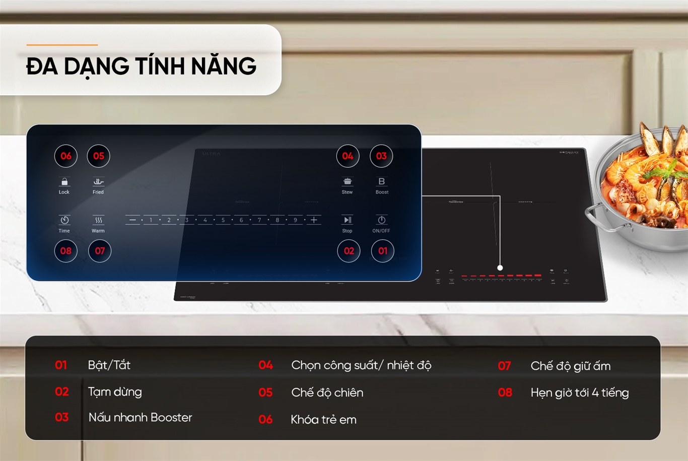 Cảnh báo chống tràn: Khi nước tràn ra mặt kính (tới khu vực bảng điều khiển), bếp sẽ tự động ngắt để đảm bảo an toàn cho người sử dụng và hạn chế làm hỏng bếp.