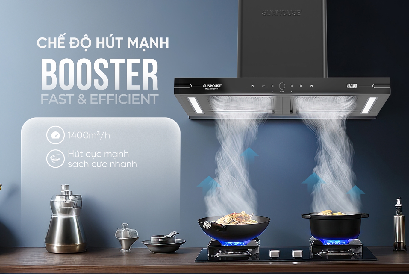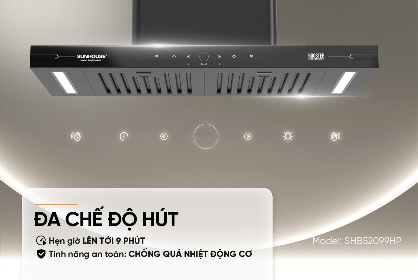 Máy hút mùi SUNHOUSE SHB52099HP trang bị chế độ Booster, giúp nâng công suất hút lên tối đa 1400 m³/h trong thời gian ngắn, loại bỏ nhanh chóng khói và mùi khó chịu. Động cơ tua-bin với thiết kế cánh quạt tối ưu mang lại lực hút mạnh và ổn định, đặc biệt hiệu quả với các món chiên, xào, nướng,... Nhờ chất liệu bền bỉ và khả năng tản nhiệt tốt, động cơ hoạt động lâu dài mà vẫn giữ hiệu suất cao. Cơ chế vận hành linh hoạt giúp mùi được hút triệt để, hạn chế lan tỏa ra không gian xung quanh, mang lại bếp sạch sẽ, trong lành và dễ chịu.