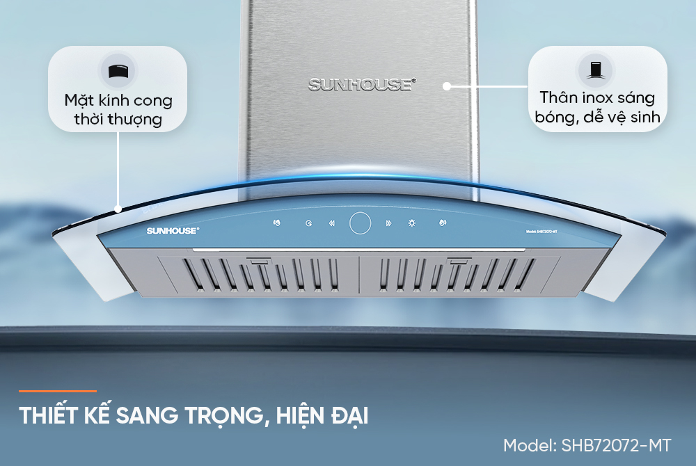 Máy hút mùi SUNHOUSE SHB72072-MT sở hữu kiểu dáng kính cong đẹp mắt giúp tạo điểm nhấn cho không gian bếp. Thân máy được làm bằng inox sáng bóng, không bị oxy hoá (gỉ sét), dễ dàng vệ sinh và không nhiễm từ. Loại chất liệu này không chỉ đảm bảo độ bền cho sản phẩm mà còn thân thiện với người sử dụng.