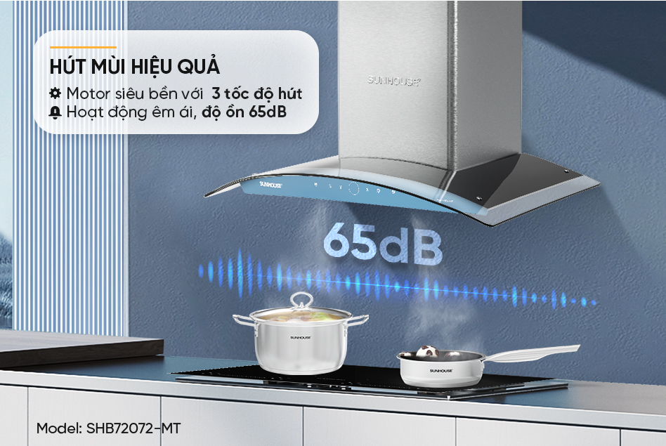 Máy hút mùi kính cong SUNHOUSE SHB72072-MT có công suất 750m³ /h, 3 tốc độ hút cho hiệu quả hút mùi tốt ưu lại tiết kiệm điện năng. Mùi dầu mỡ hay các mùi khó chịu khác trong quá trình nấu nướng sẽ nhanh chóng bị hút sạch, không ám mùi lên quần áo, các vật dụng nhà bếp hay các không gian liền kề khác (điển hình như thiết kế căn hộ chung cư). Đặc biệt, máy vận hành êm ái với độ ồn chỉ 65db nên không hề gây ảnh hưởng đến sinh hoạt của gia đình bạn.