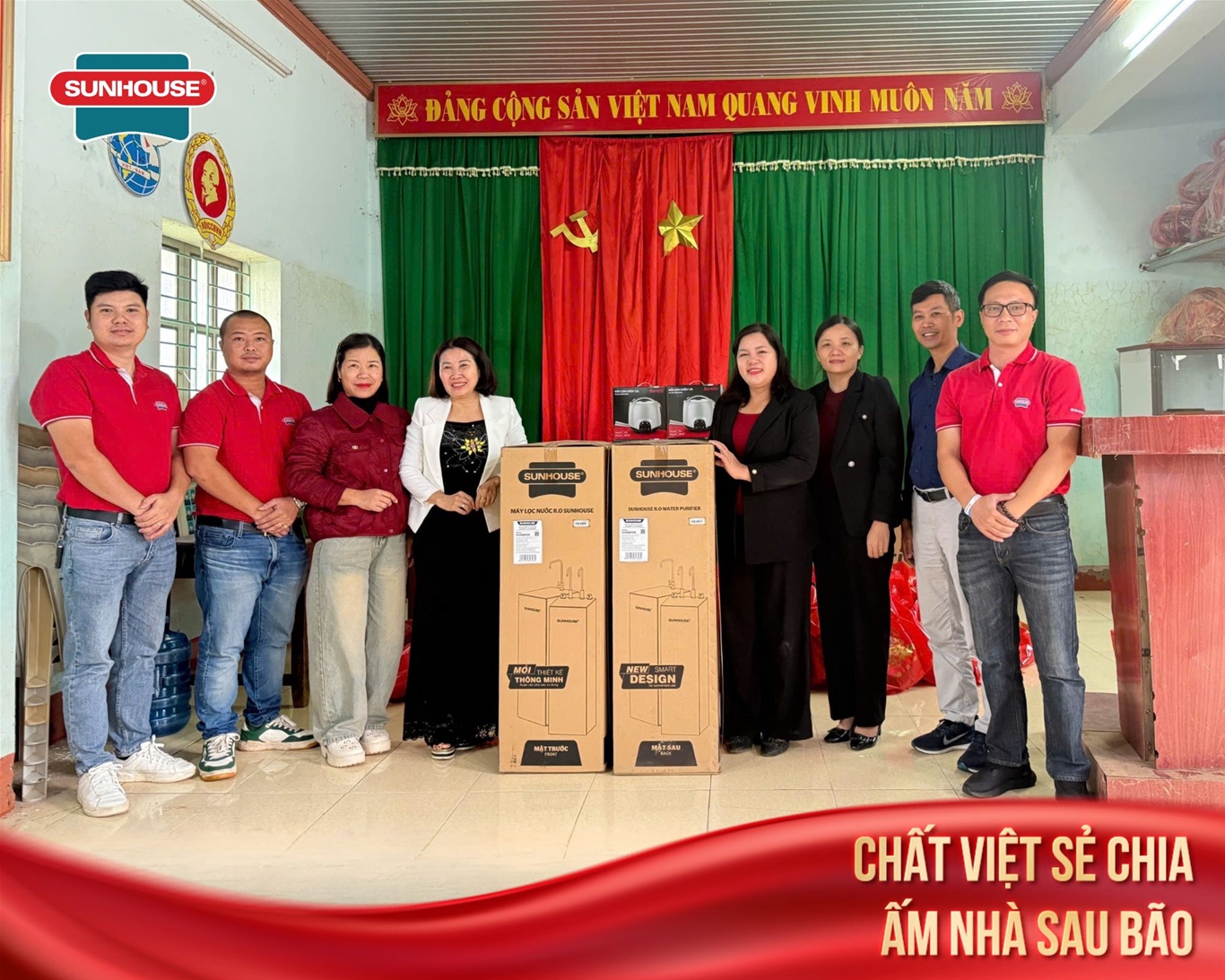 Sau bão lũ, nguồn nước sạch và an toàn luôn là vấn đề cấp thiết hàng đầu. Hiểu được điều đó, SUNHOUSE đã trao tặng máy lọc nước R.O cho nhiều trường học, cơ quan, giúp người dân có thể yên tâm sử dụng nguồn nước sạch trong sinh hoạt hằng ngày.
